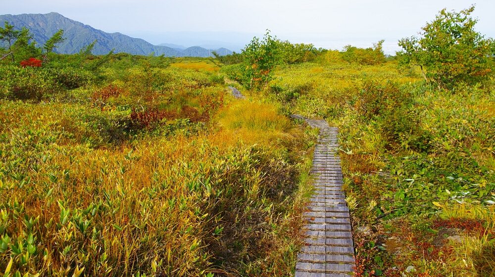 【標高1,850m追分】弘法方向の湿原地帯を通る木道。