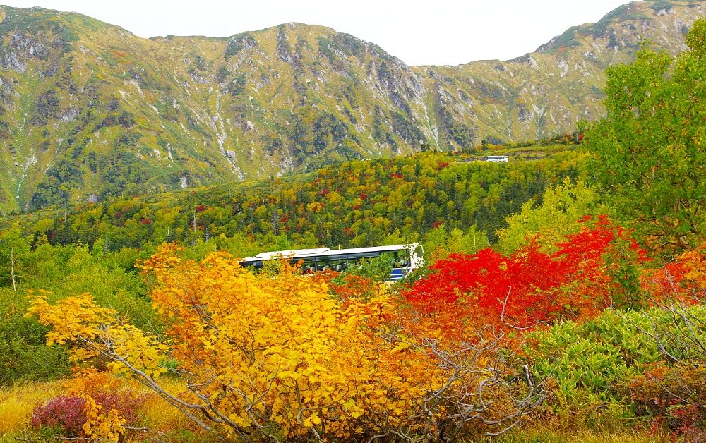 【標高2,000mヒュッテ跡地】紅葉の中を走るアルペンルート高原バス
