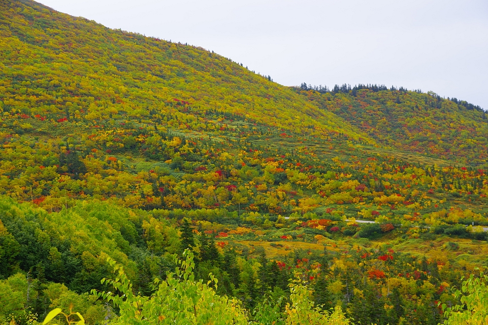 『標高の高い所で晩秋の紅葉を眺め、より標高