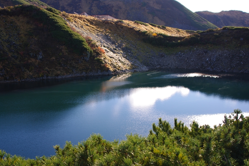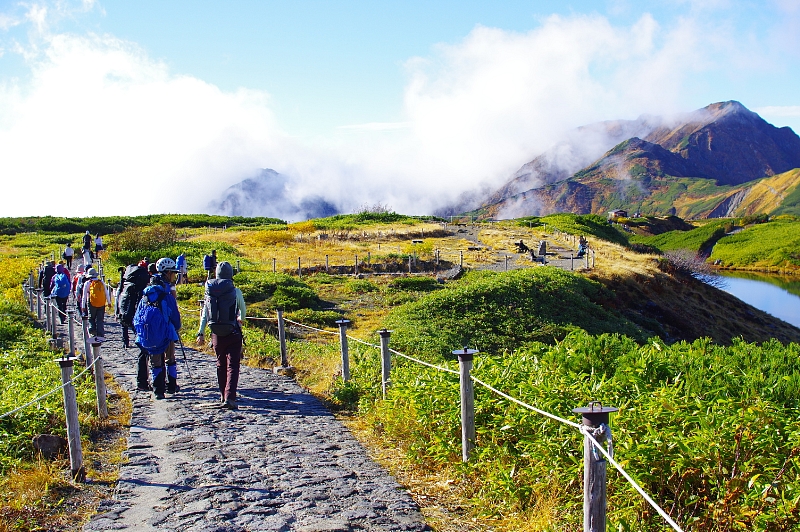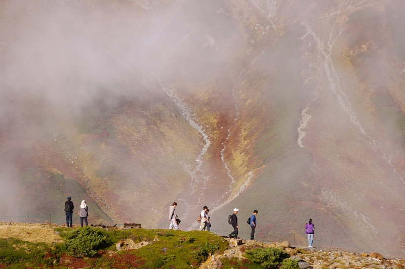 地獄谷から湧き上がるガスと雷鳥荘方向に向かう人々