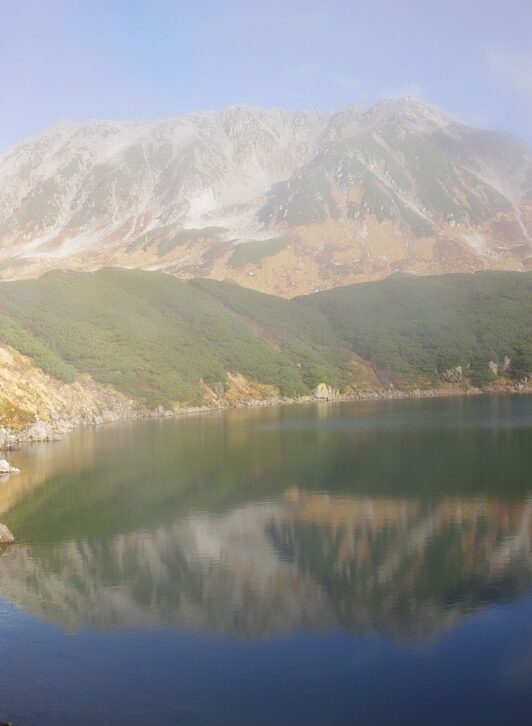薄霞に包まれたミクリガ池と逆さ立山三山