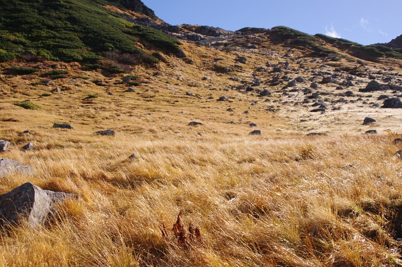 灌木類の紅葉、枯草たちが微妙な配色をもって、立