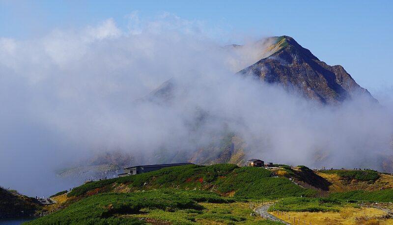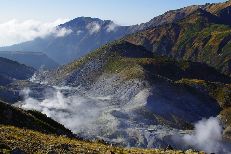 ガスが立ち上ってきた奥大日岳※手前はみくりが池温泉とガス監視ステーション