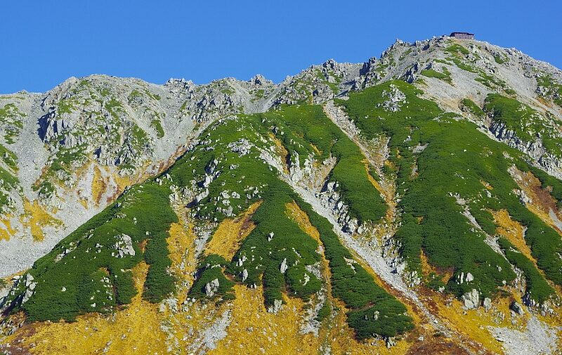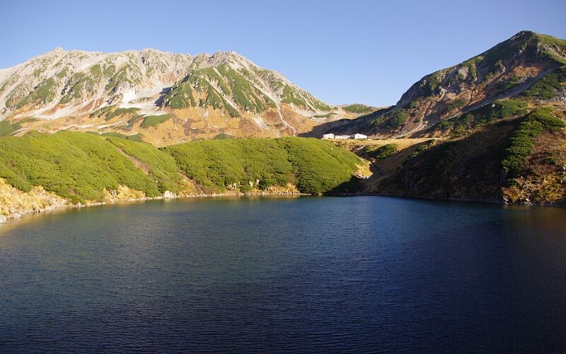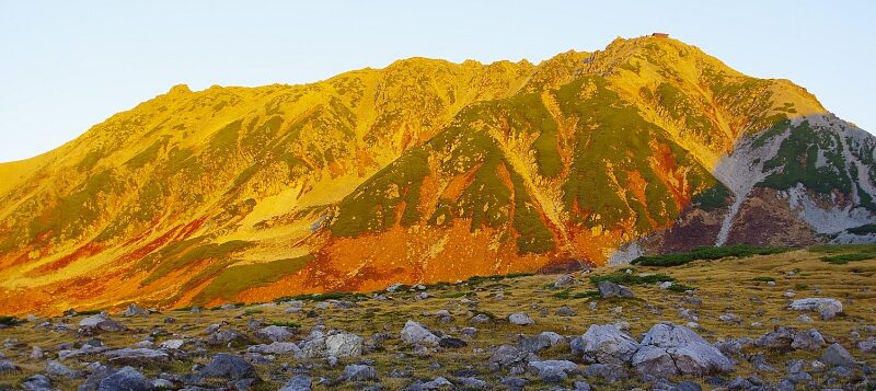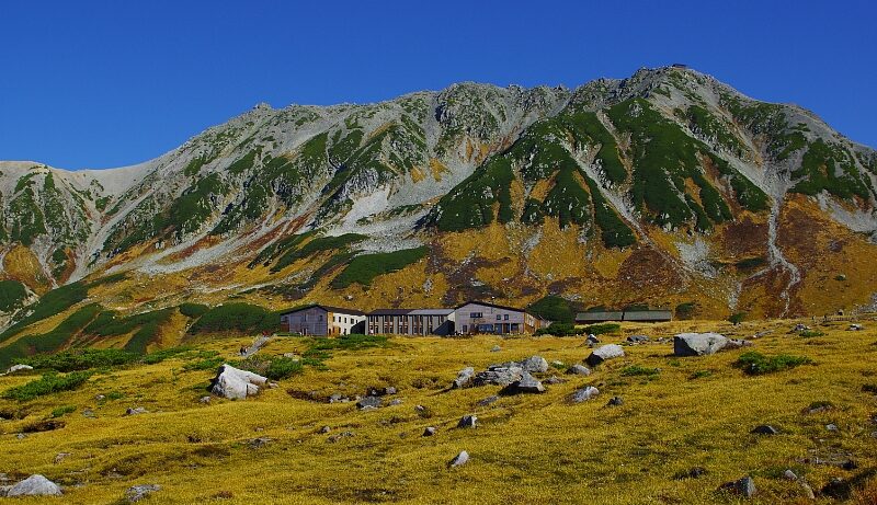 ずっと日中は雲一つなく晴れ渡っていました。(立山三峰と室堂山荘)