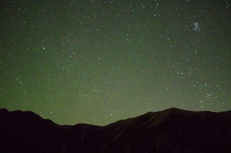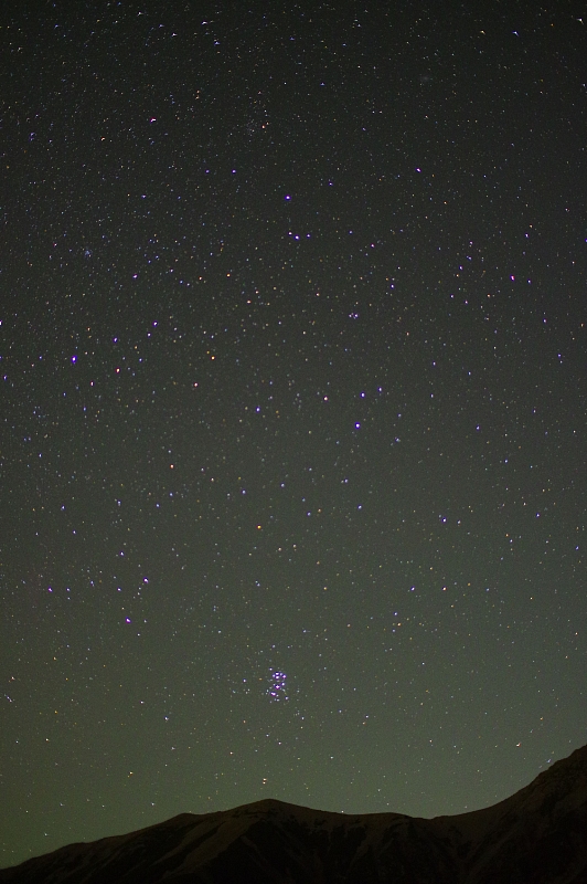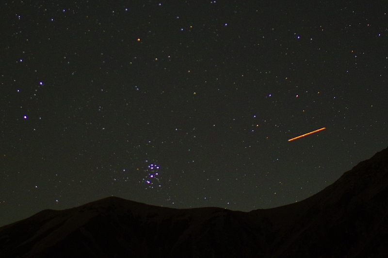 真砂岳直情に上ってきたプレアデス星団(スバル)と近づく飛行機
