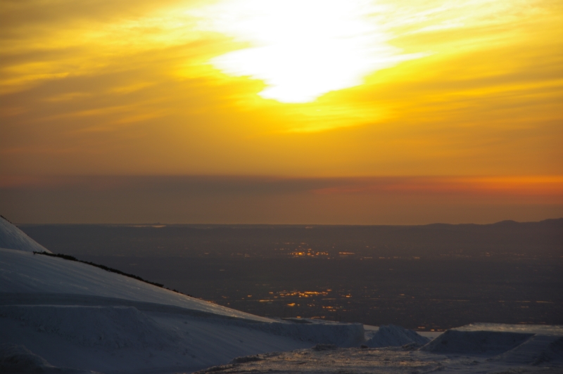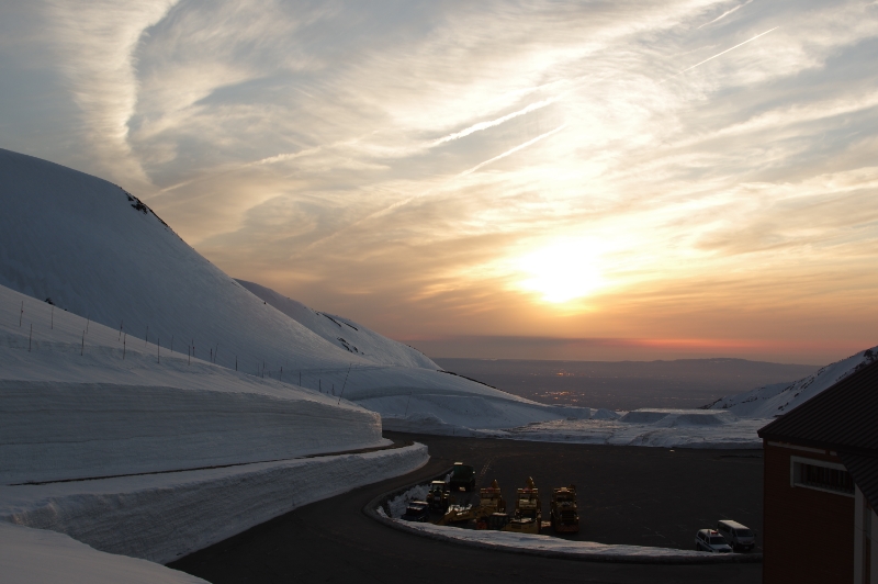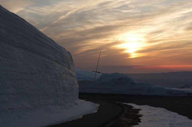 アルペンルート雪の大谷付近と天狗平の高原ホテルの夕日遠望