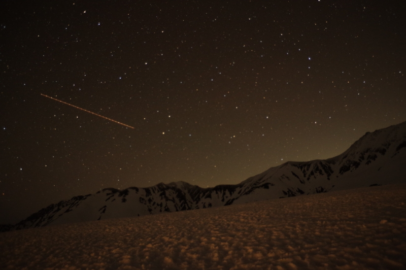 室堂平の雪原と剱御前~別山~真砂岳方面の星空。ツツツート、飛行機が横切っていきました。