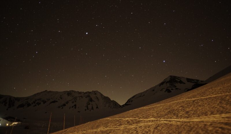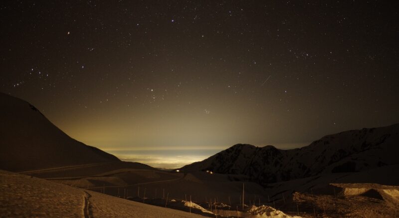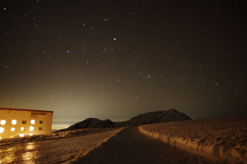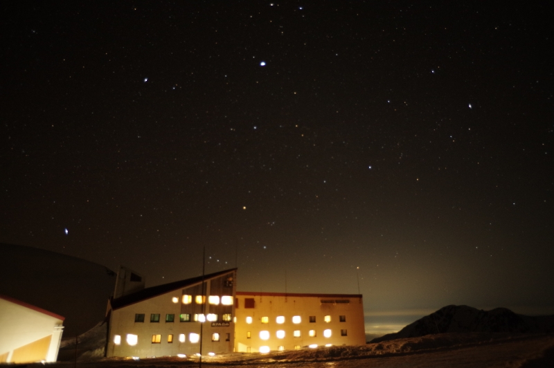 ホテル立山の直上に輝くシリウス、オリオン座、その上の木星、ふたご座。ホテル立山は、本年は8月いっぱいまで営業とのこと。