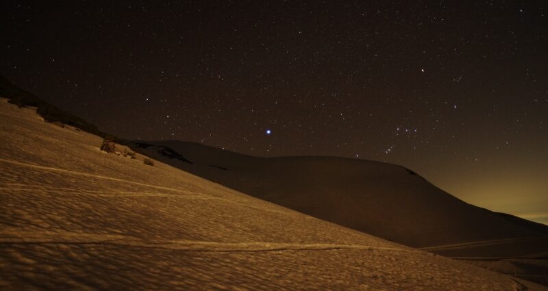国見岳に沈みがけのオリオン座とシリウス。冬の星座から春の星座へバトンタッチ。