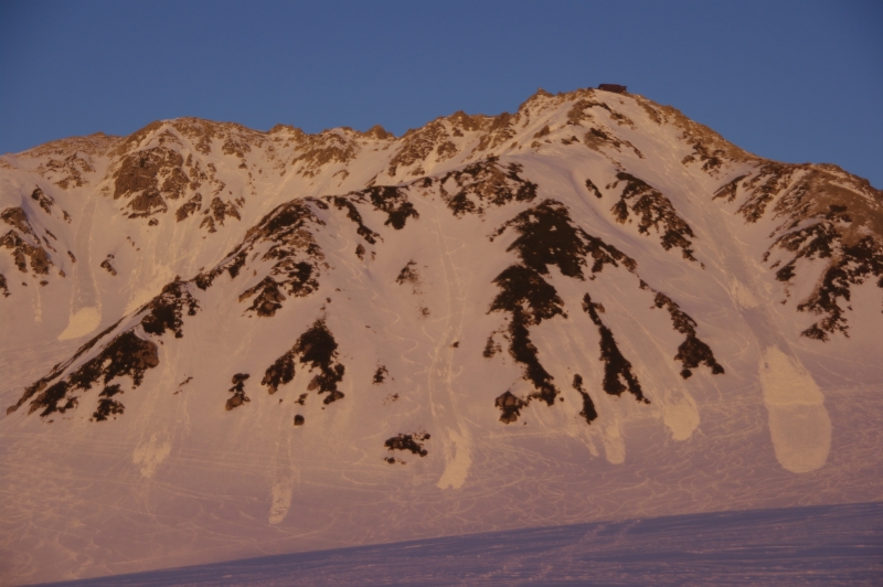 少し夕陽に染まっている立山三峰。雪崩の箇所が増えてきています。ご注意を!