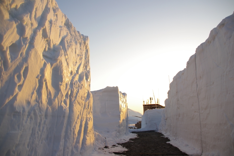自然保護センター山側の宿舎前通路。南極の氷のように、夕陽で光っていました。