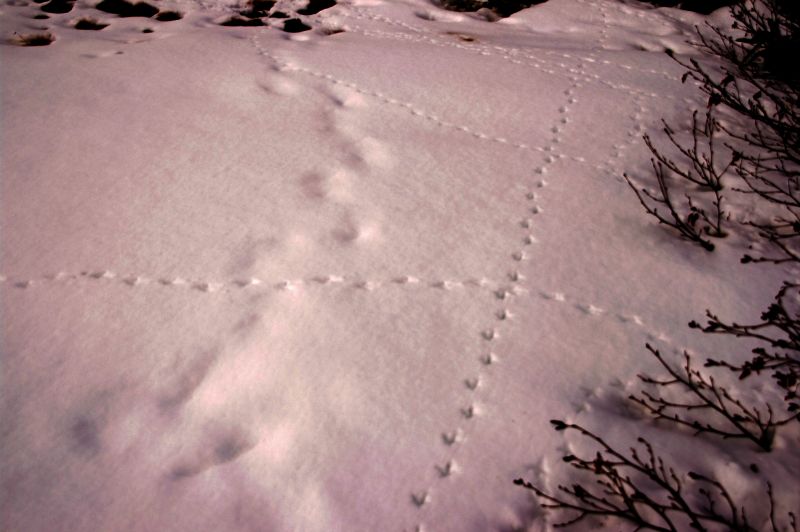 「ライチョウ交差点」室堂山荘近くのハイマツ林。ライチョウの足跡が十字に交差していました。