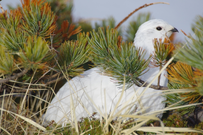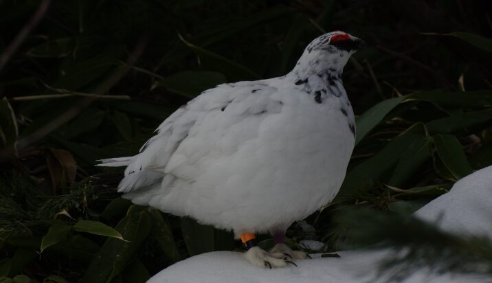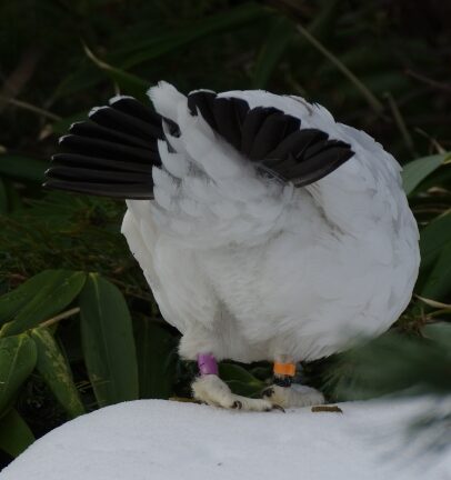 室堂山荘近くのハイマツ林にて。前日は、つがいでいたオスです。2024年にエンマ台近くで足環がつけられた個体です。