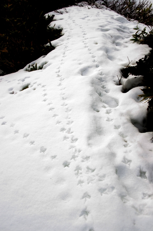 みくりが池温泉・火山ガス監視ステーション近くの雪原を移動するオス。