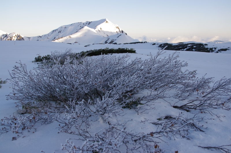 凍り付く樹々と奥大日岳